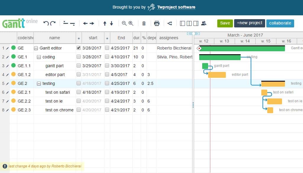 TW Gantt — это JavaScript-компонент, построенный на основе jQuery, предназначенный для создания диаграмм Ганта, древовидных структур задач и зависимостей с возможностью экспорта данных в формате JSON. Основные функции включают: