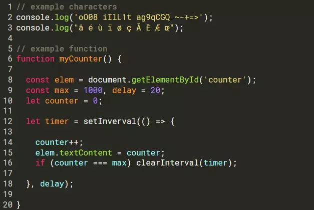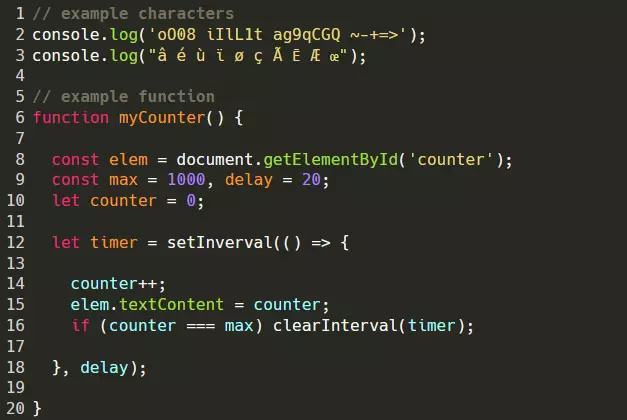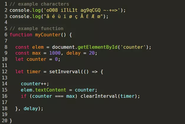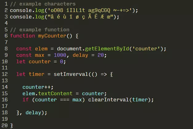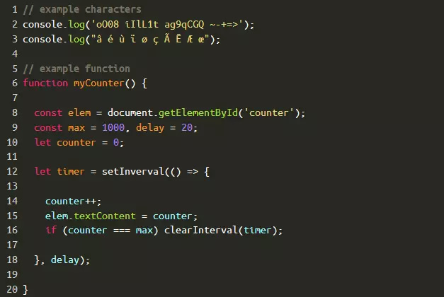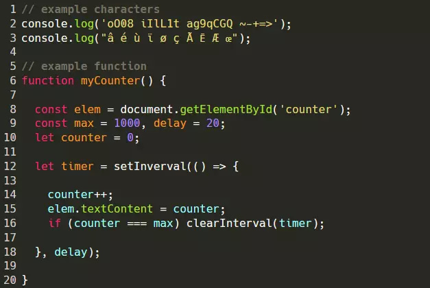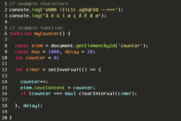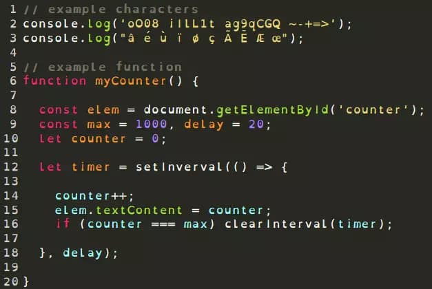 - Шрифт для программирования с четким различением похожих символов, таких как 0 (ноль) и O (заглавная буква o); 1 (единица), I (заглавная буква i) и l (строчная буква L); типы скобок, расположение символов, интервал между буквами и так далее.