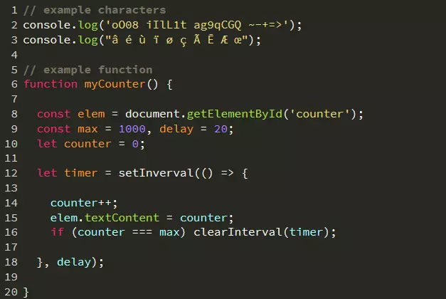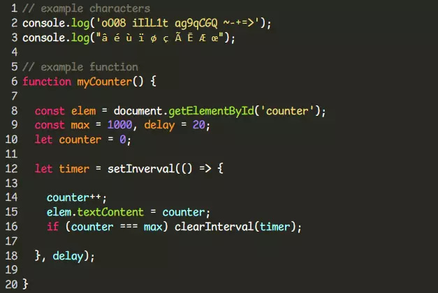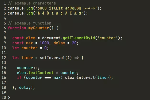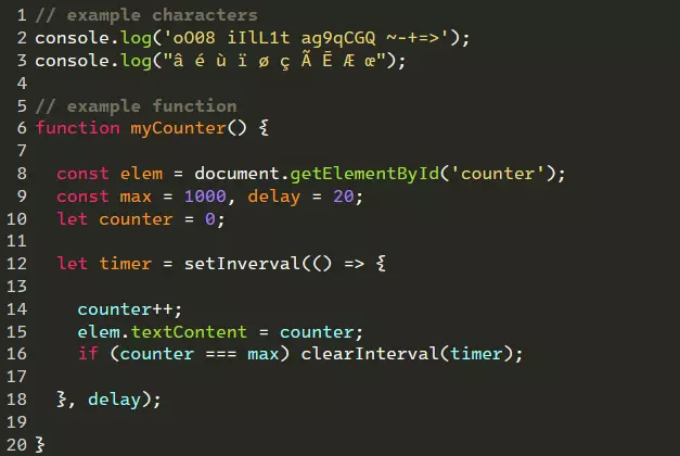 Такие сайты, как programmingfonts.org позволяют просматривать десятки бесплатных шрифтов для программирования, и я использовал их для примеров скриншотов ниже. В изображениях используется одна и та же тема, размер и высота строки, поэтому они выглядят внешне похожими. Они могут выглядеть по-разному в зависимости от вашей операционной системы, экрана, редактора, темы и интервалов — так что будьте готовы к некоторым экспериментам и настройкам.