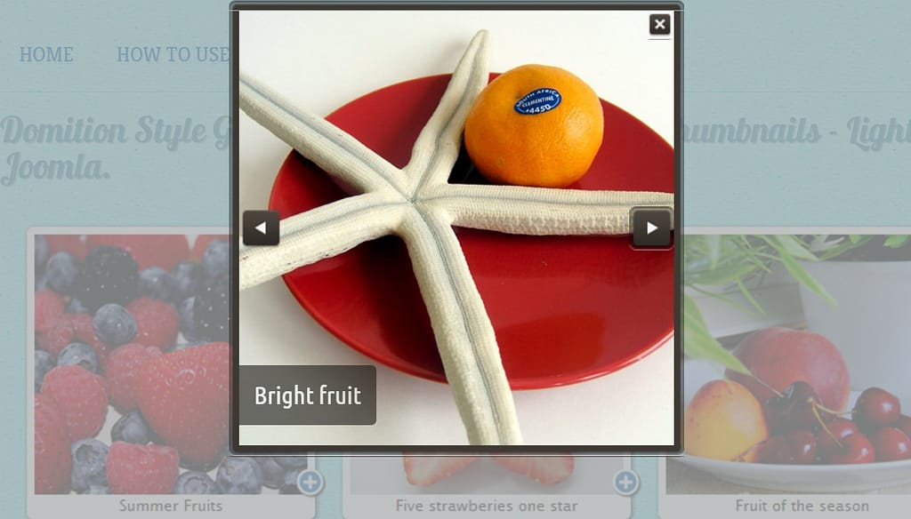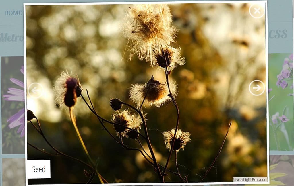 Правильное слайд-шоу для цветочного магазина и биологических сообществ — это галерея изображений Metro. Если вы наведете курсор мыши на миниатюру лайтбокса, вы увидите, что снизу появится поле описания. Если вы нажмете на него, то попадете в начало галереи. Здесь вы найдете окруженные стрелки и описание в белом и сером цветах, позволяющие пользователям легко переключать изображения. Размер рамки галереи плавно изменяется в соответствии с размером изображения.