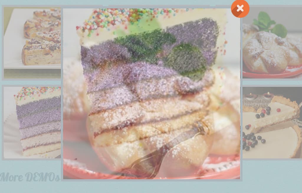 В этой галерее каждый эскиз имеет легкую рамку с описанием и кнопки, выглядящие замечательно на любом устройстве. Тема этого слайдера может напоминать летний завтрак. Открытие главной галереи показывает затемненную рамку. Для того, чтобы подчеркнуть изображение в центре есть серый полупрозрачный фон. Темные стрелки появляются, как только вы наведете курсор на изображение. Это слайд-шоу будет прекрасно соответствовать странице меню для кафе или ресторана, чтобы показать асортимент десертов заведения.