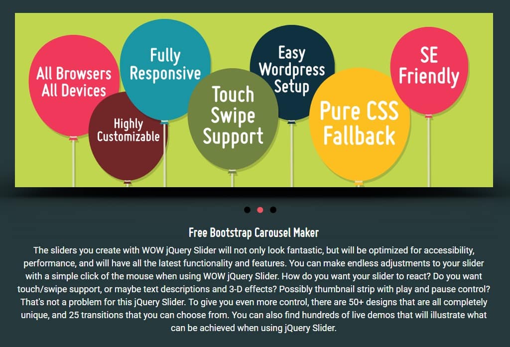 Слайдер выглядит современным и приятным в реализации. Применение буллитов делает навигационную систему интуитивно понятной, поэтому эта карусель проста в понимании и применении.